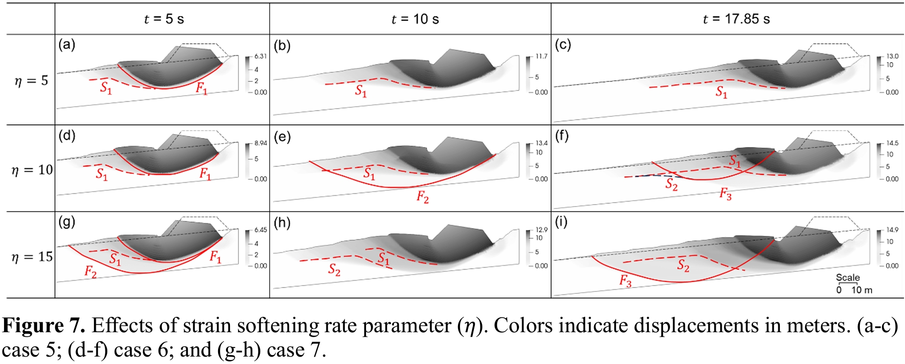 The simulation results reveal that a downward progressive landslide initiates with a localized flow slide surrounding the embankment and usually involves a combination of various failure modes.